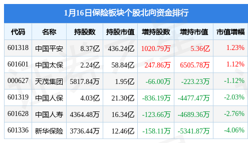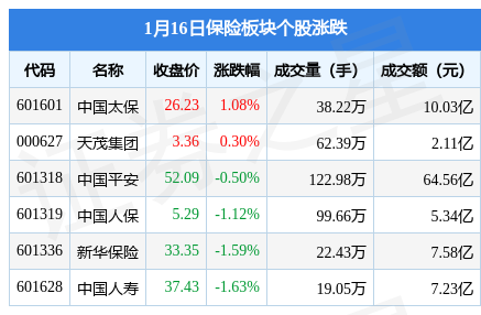 1月16日保险板块较上一交易日下跌0.94%,中国人寿领跌。当日上证指数报收于3227.59,上涨1.01%。深证成指报收于11785.77,上涨1.58%。保险板块个股涨跌见下表: