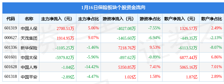 从资金流向上来看,当日保险板块主力资金净流出4.17亿元,游资资金净流入1.64亿元,散户资金净流入2.54亿元。保险板块个股资金流向见下表: