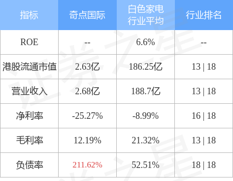 奇点国际港股市值2.63亿港元,在白色家电行业中排名第13。主要指标见下表: