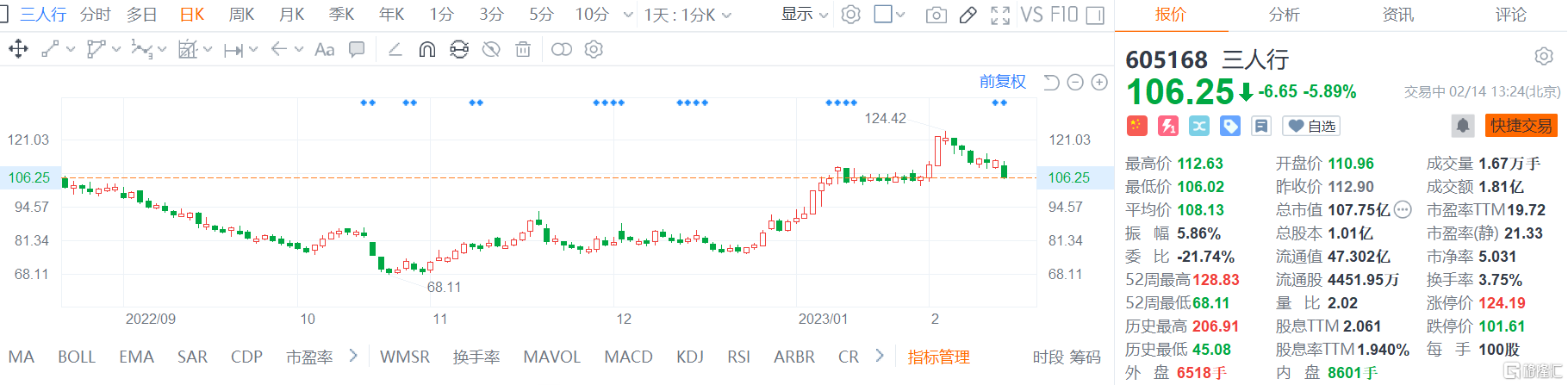 格隆汇2月14日丨三人行(605168.SH)股价震荡走低,现报106.25元,跌幅5.9%,总市值107.75亿。公司昨日公告称,股东及董监高拟合计减持不超过93.74万股,约占公司当前股本的0.9244%。