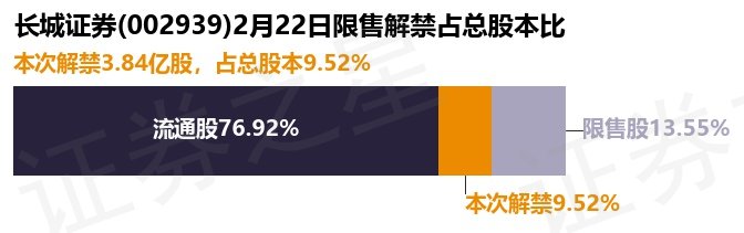 根据市场公开信息整理,长城证券(002939)(002939)于2月22日将有3.84亿股限售股份解禁上市,为公司定向增发机构配售股份,占公司总股本9.52%。本次解禁后,公司还有5.47亿股限售股份,占总股本13.55%。具体如下图所示:
