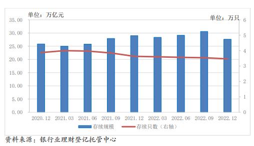 具体来看,截至2022年底,全国共有278家银行机构和29家理财公司有存续的理财产品,共存续产品3.47万只,较年初下降4.41%;存续规模27.65万亿元,较年初下降4.66%。